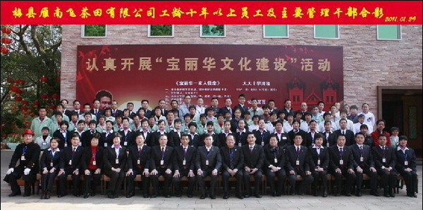 春节前夕,在梅县雁南飞茶田有限公司工作连续十年工龄以上的92名员工每人收到了一个雁南飞商标纯金饰品的奖励。