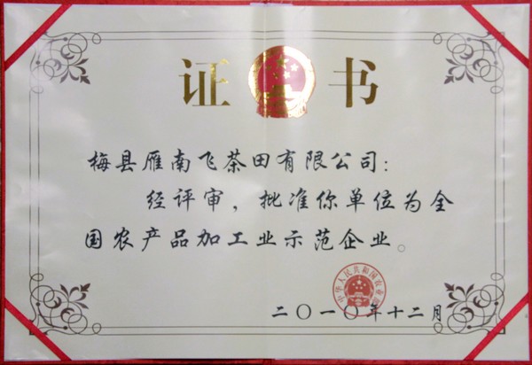 日前,国家农业部下发(农企发[2010]5号)文件,及广东省农业厅下发(粤农[2011]48号)文件,转发“农业部关于公布第二批全国农产品加工示范企业和第四批全国农产品加工示范基地名单的通知”精神。我公司梅县雁南飞茶田有限公司榜上有名。特此祝贺。