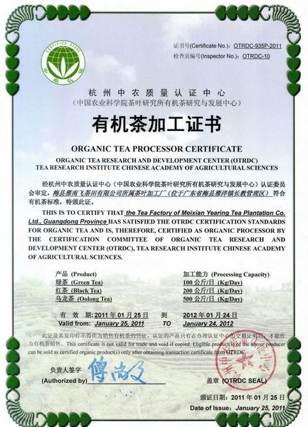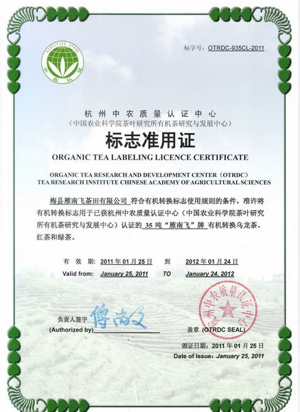 经杭州中农质量认证中心(中国农业科学院茶叶研究所有机茶研究与发展中心)认证委员会审定,梅县雁南飞茶田有限公司所属雁南飞茶场按有机方式生产,符合有机茶加工标准,喜获“有机茶加工证书” 及“有机茶标志准用证书” 。