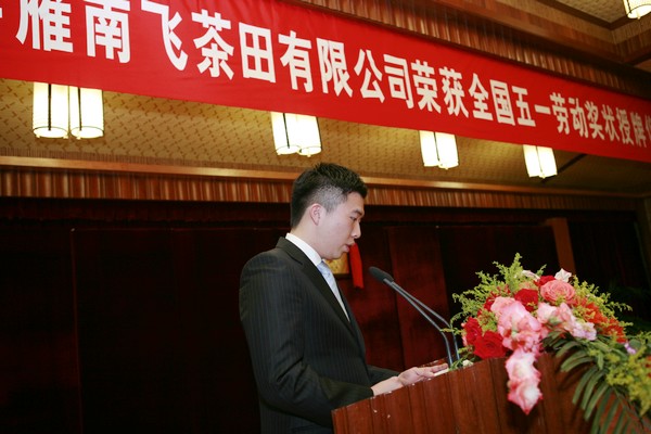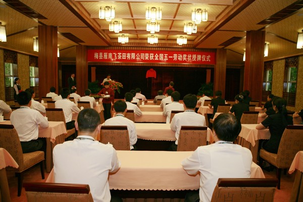 2011年04月29日上午,广东省庆祝“五一”国际劳动节暨劳动模范表彰大会在广州隆重召开。大会向今年受表彰的19个全国五一劳动奖状、70名全国五一劳动奖章、50个全国工人先锋号的集体和个人代表及179名广东省五一劳动奖章和198个广东工人先锋号获得者代表颁奖。梅县雁南飞茶田有限公司荣获“全国五一劳动奖状”荣誉称号,叶林副总经理代表雁南飞茶田有限公司出席表彰大会并领奖。