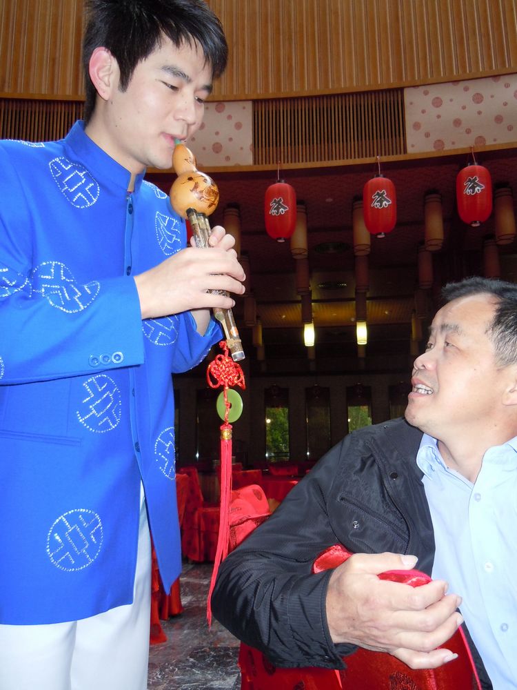 梅州雁南飞山歌艺术团一年要在景区内围龙食府同一舞台上演出300多场。陈式伟入团后便拿出了“看家”的吹笛、吹葫芦丝本领,奏响了《月光下的凤尾竹》、《竹林深处》等20多首民族乐曲。一上场便打动了观众,增加了艺术团的新节目。