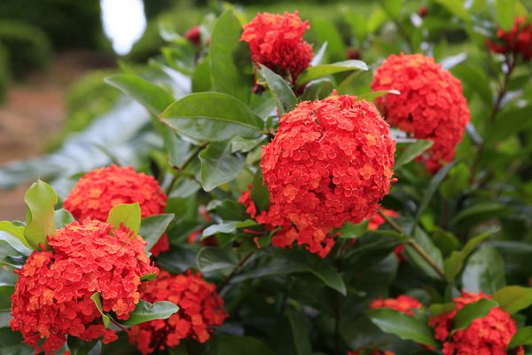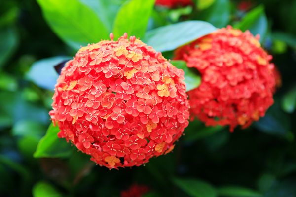 山丹花又称为仙丹花、龙船花,就是俗称矮仙丹的常绿灌木。其他还有红绣球、买子木、卖子木、三段花等别名。英文名称为Chinese ixora,正式学名为Ixora chinensis。山丹花全株侧枝向上挺直生长且平滑,叶子表面光滑革质对生,全缘而呈倒卵形状或是椭圆形。一般长度约9厘米-12厘米左右,宽约4厘米-5厘米。表面是深绿色,背面的颜色较浅。而洋山丹花的叶片形状则呈托叶三角形或长椭圆形,表面的叶脉比较明显。叶子的出梢期第一次大约在每年的3月-6月之间,第二次约在8月到10月上旬左右。