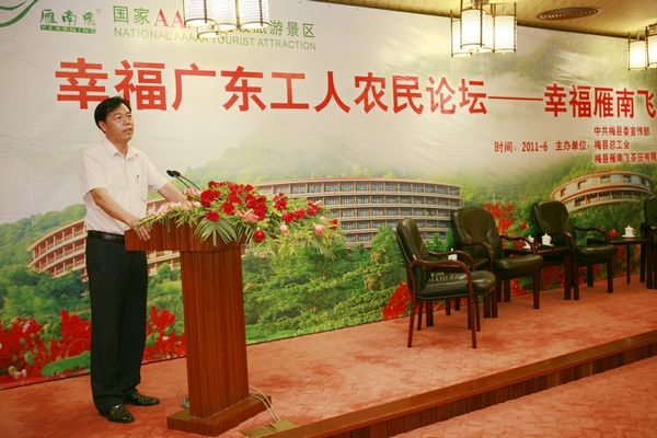 6月20日下午,幸福广东工人农民论坛——幸福雁南飞,在雁南飞茶田景区进行,梅州市委宣传部、梅州市总工会、梅县县委宣传部、梅县人大常委会、梅县总工会有关领导以及雁南飞茶田干部员工120多人参加了“幸福雁南飞”论坛。论坛由梅县总工会李秀招副主席主持,县委宣传部黎志健副部长作了“什么是幸福”的专题报告,雁南飞茶田叶林副总经理作了题为:“以人为本 构建幸福大家庭”的讲话,干部员工代表:郭进元、陈式伟、林影红、郑莹莹分别代表不同的岗位和个人在雁南飞工作的幸福感受作了专题发言,县人大副主任、县总工会主席刘敏作了总结讲话,对论坛的成功召开给予了高度的评价,论坛取得了圆满成功。