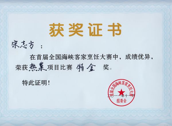 近日,首届全国海峡客家烹饪大赛在福建连城闭幕,由雁南飞围龙食府选派的宋志方、叶百生两位大厨凭借热菜“客家娘酒鸡”和“珍珠萝卜丸”,从120多名参赛选手中脱颖而出,获得热菜项目“特金奖”。特此祝贺!