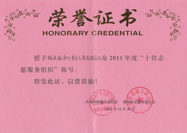 近日,共青团梅州市委员会、梅州市志愿者联合会联合授予梅县雁南飞青年志愿者服务队为2011年度“十佳志愿者服务组织”和“志愿者行动组织”荣誉称号;授予陈锦芳、谢乐为第五届客家高峰论坛“优秀志愿者”称号;授予洪淑玲、陈利芬为第二届世界客商大会“优秀志愿者”称号。