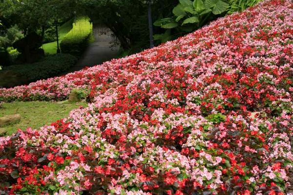 粉红与鲜红纷纭交划的俨如花的海洋般的大片海棠花