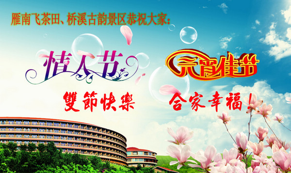 梅县雁南飞茶田有限公司旗下国家5A级旅游景区——梅县雁南飞茶田景区、美丽中国十佳旅游村——桥溪古韵景区恭祝大家:元宵佳节、情人节双节快乐,合家幸福!